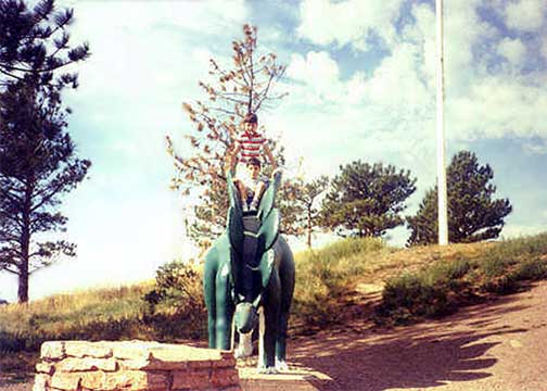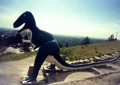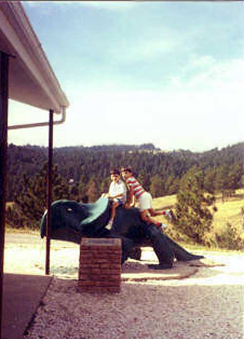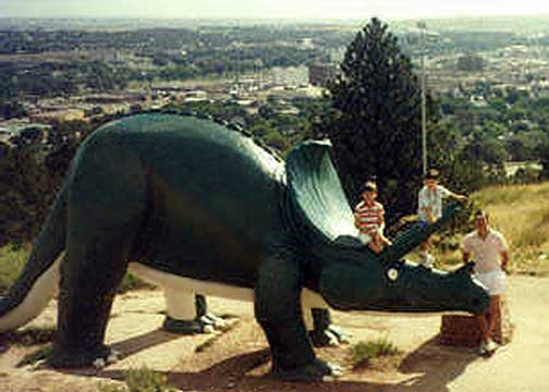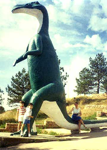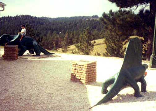 August 1990 While heading towards the Black Hills in South Dakota, we happened upon a dinosaur park that had about 6-8 life-sized dinosaurs. The Dinosaurs were fun for the kids; they climbed on some and chased each other around. It was free too. I don't know if they've built any concessions or anything around there now. There was nothing back then. The photos aren't the best as we had a small cheap camera and I didn't have all this technology of today (scanner, Photoshop etc) So this is as good as I can make them sorry.