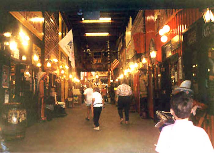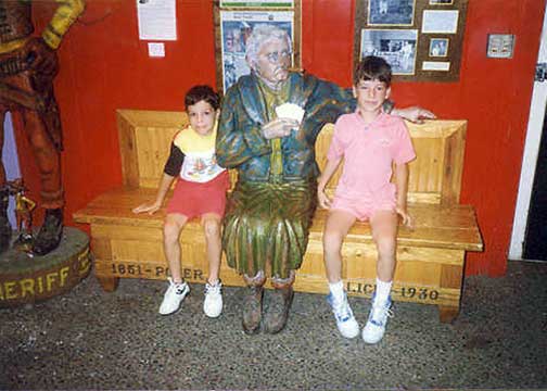 August 1990 Wall Drug is probably the place that started the phrase "Tourist Trap". It started as a small drug store where a man wanted to promote his business. The little towns in South Dakota are far apart. You can drive for a very long time before finding civilization, so his place was a stop; but some people missed it, so he decided to start advertising with a billboard, offering free ice water. Lots of people stopped and so he continued advertising. You will see many, many (seems like a couple hundred!) billboards advertising his place for many miles..... but then the drug store grew and now it's a mall of sorts, but not any regular mall. When we went, it was a super large knick knack store, where you can buy "touristy" things like key chains, T-shirts, spoons, ash trays, plates and that sort of stuff. It's had a number of western themed figures in it (you know, like the Cigar Store Indian). It's free and I don't know if you can get free ice water, but there is a place to buy snacks and drinks as well as a full-fledged restaurant. Restrooms available too. Did you know, they give away free Wall Drug signs? Just ask! Left to Right: 1) The kids with Poker Alice 2) Inside Wall Drug