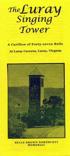 We decided it was time to travel to Shenandoah for a mid-week vacation. We figured fall in mid-week was the best way to see the fall colors as well as beat the crowds. So our trip was Tuesday through Thursday. We didn't realize what this was but it was right in the middle lane between the Luray Caverns and the Luray Zoo almost... so we kept passing it so went up to it. It was a gift to the town from Colonel Northcott, a well known citizen from the town of Luray.. It's also known as the Belle Brown Northcott Memorial. It was erected in 1937 in memory of Colonel T.C. Northcott's wife. It stands 117 feet high and contains a carillon of 47 bells with the largest bell weighing 7,640 pounds (it's six feet in diameter). You can't go inside of it. They hold "recitals" 2 times on the Weekends (I think 2 PM Sat and Sun). Chairs are outside then for people to hear. There's a small pond to gaze at and a nice grassy area with flowers, trees and bushes (like a small park) where a picnic might be nice. Nothing special needed here except a camera.