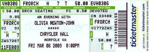 We went to see Olivia Newton John in Norfolk in March 2009. If we manage to get photos of autographs at the event, we'll post here again later. Well, we didn't take a camera thinking we wouldn't be allowed to take photos but others had cameras... oh well. No autographs either. She did not come out and I couldn't wait around. We got in too late to try earlier. She looked fantastic for her age. A LOT younger! She sounded pretty good but stopped short of some high notes here and there. She sang some of the old favorites and pushed her charities (Saving the Rain Forest and Cancer awareness). It was an okay concert. She wears a lot of black though!